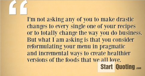 I´m not asking any of you to make drastic changes to every single one of your recipes or to totally change the way you do business. But what I am asking is that you consider reformulating your menu in pragmatic and incremental ways to create healthier versions of the foods that we all love.
