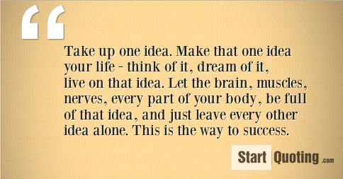 Take up one idea. Make that one idea your life - think of it, dream of it, live on that idea. Let the brain, muscles, nerves, every part of your body, be full of that idea, and just leave every other idea alone. This is the way to success.